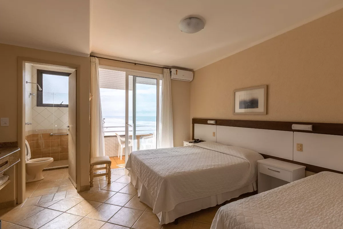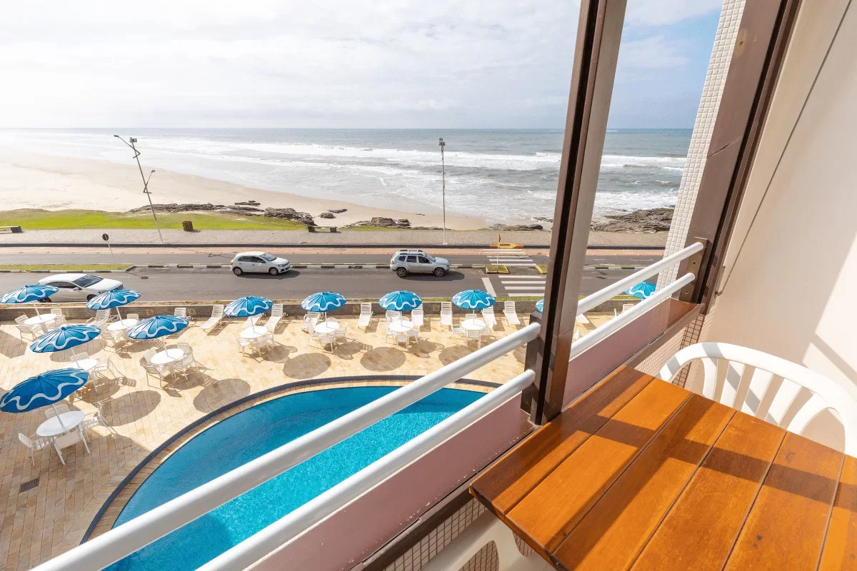 Vista frontal para o mar com acabamentos premium. Espaço amplo e confortável para sua estadia perfeita.
