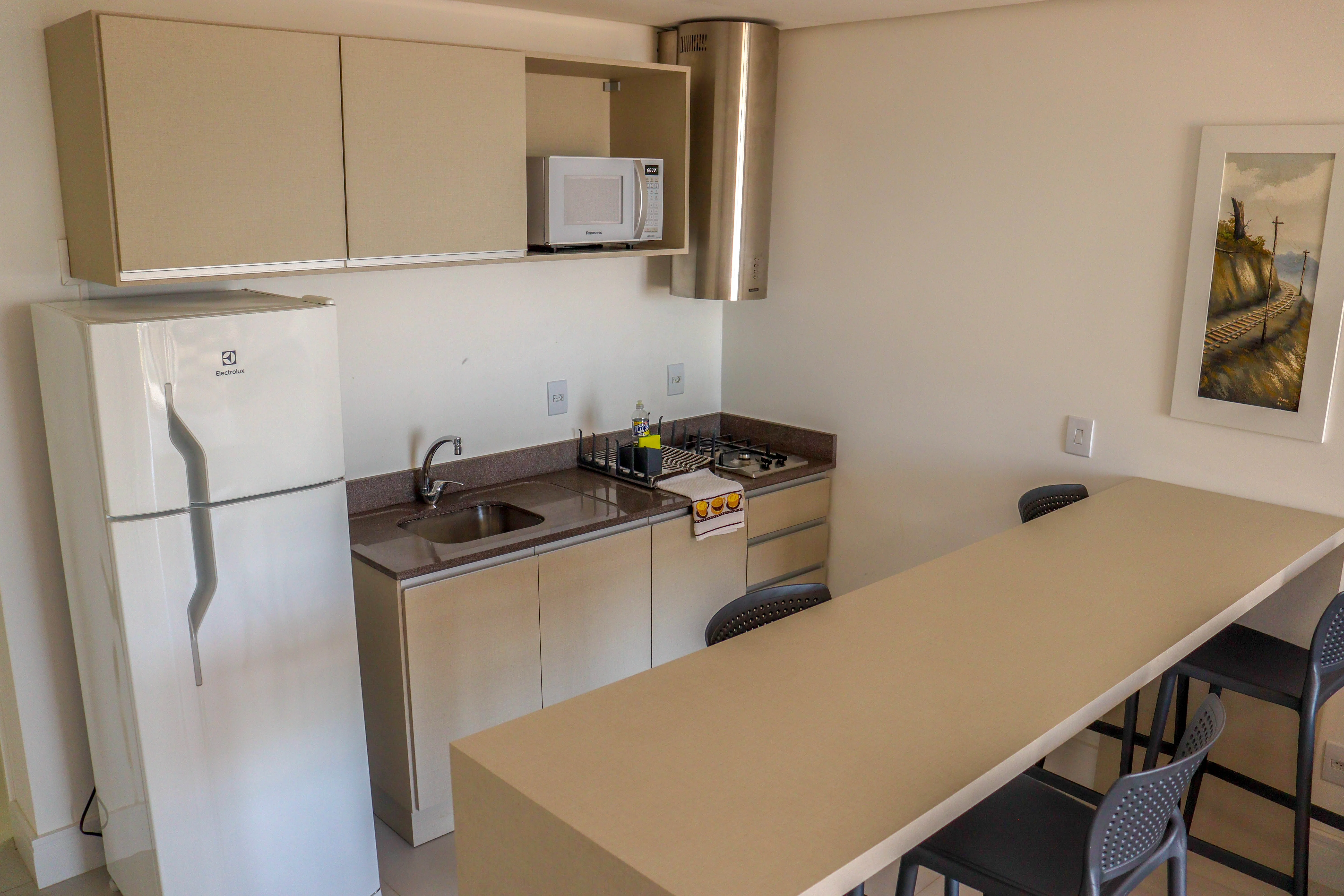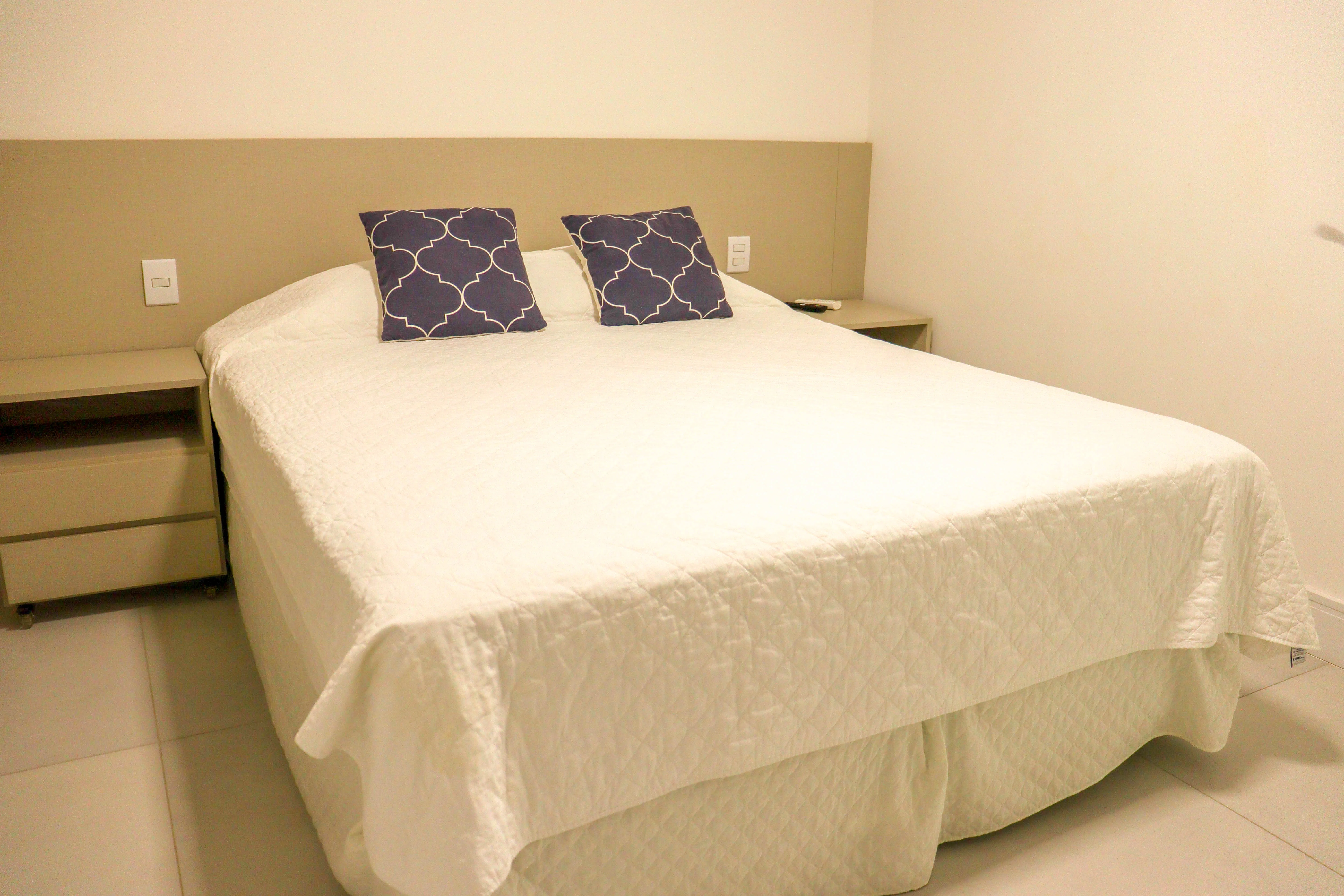 Apartamento com um quarto (cama casal). Cozinha e Sala Integrada com bicama na sala. Café da manhã servido no hotel. Serviço de Camareira incluso diariamente.