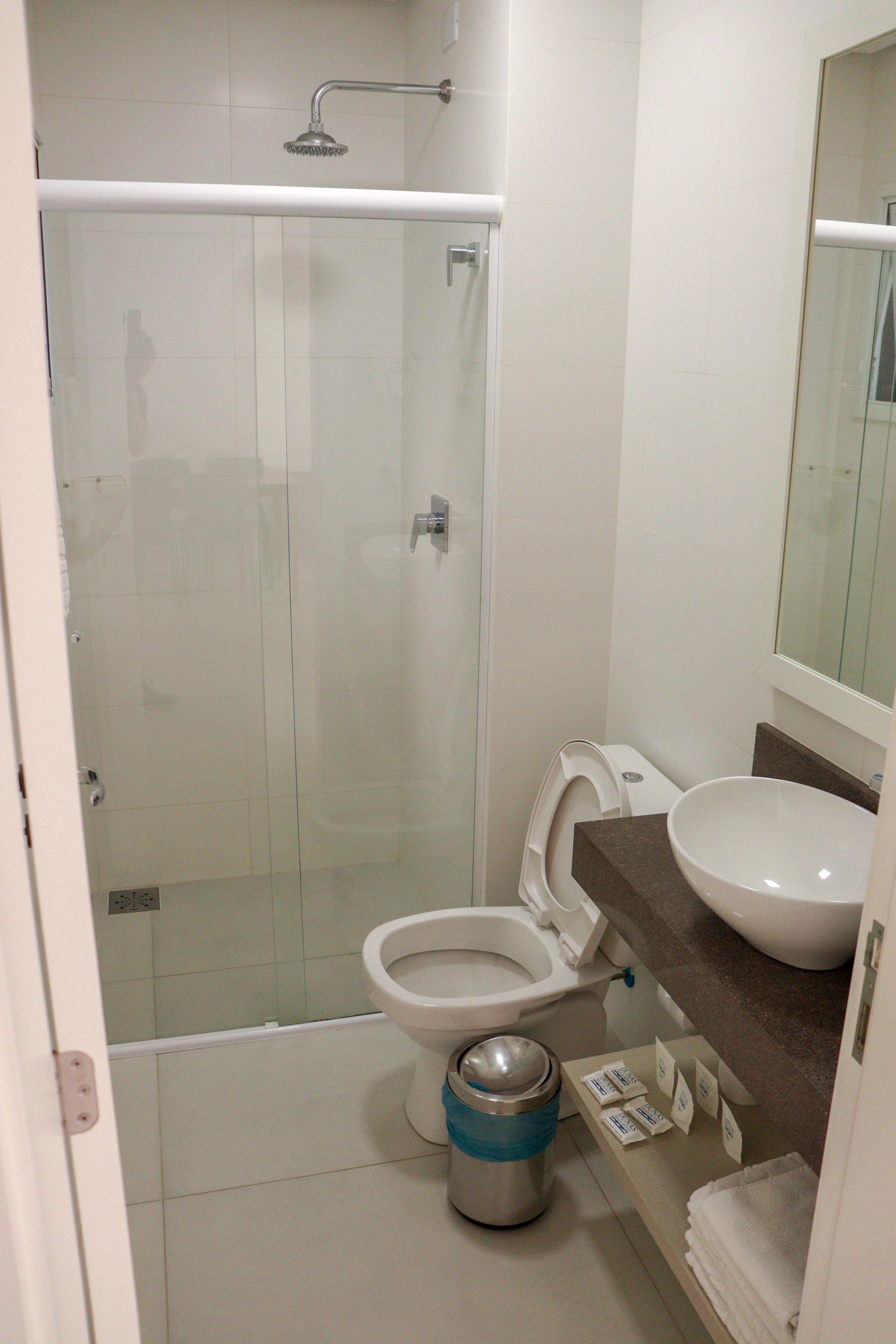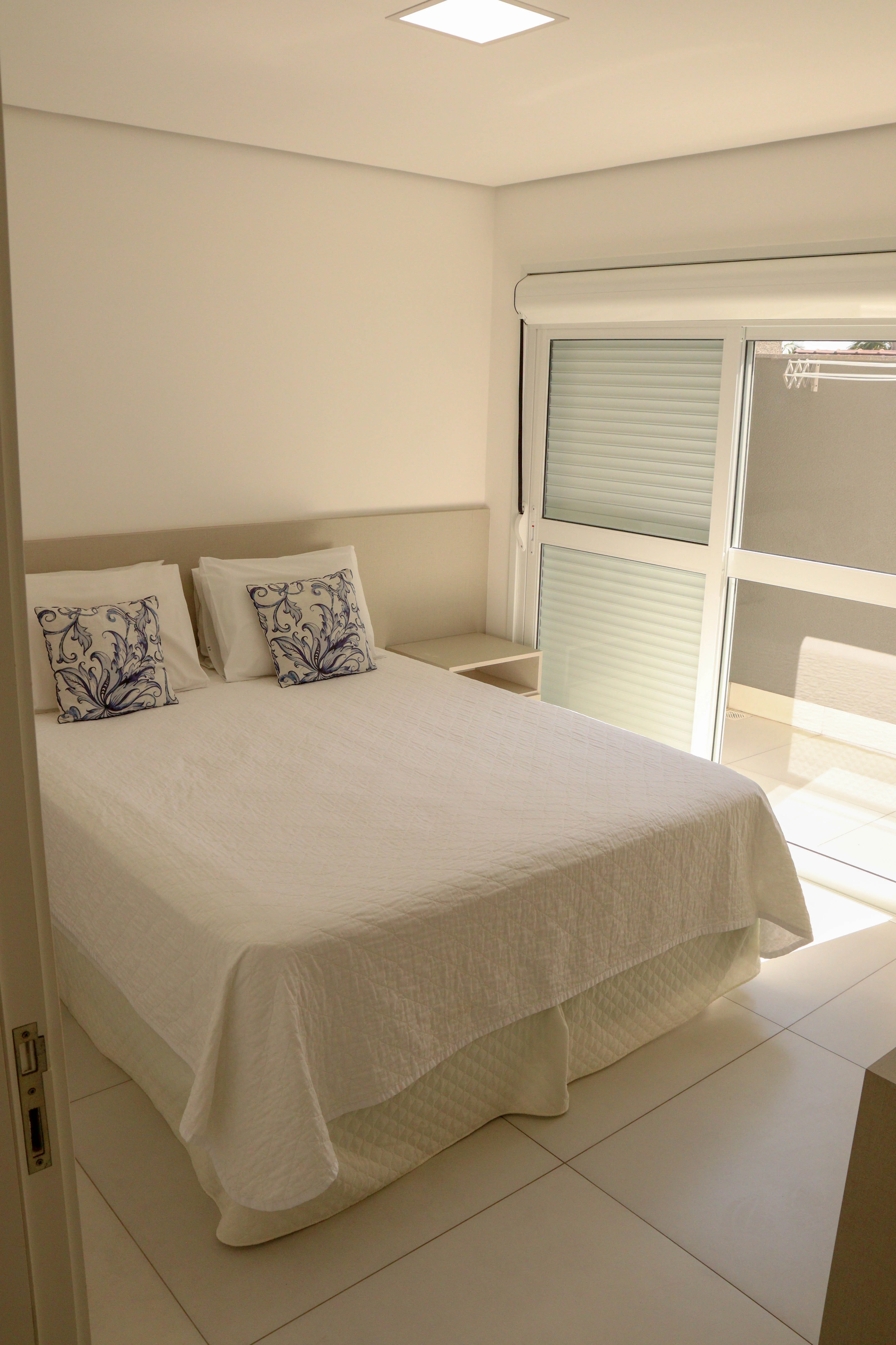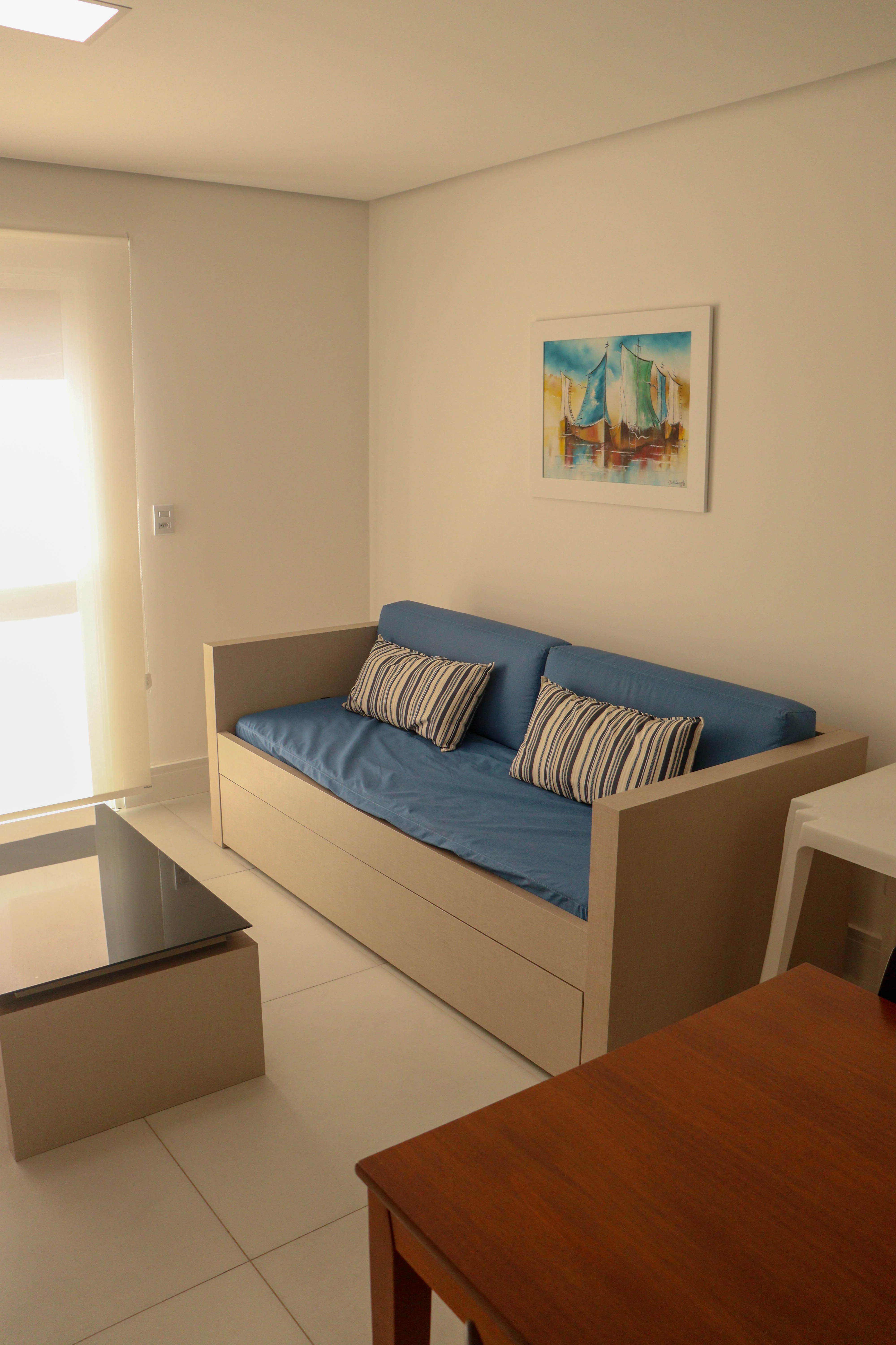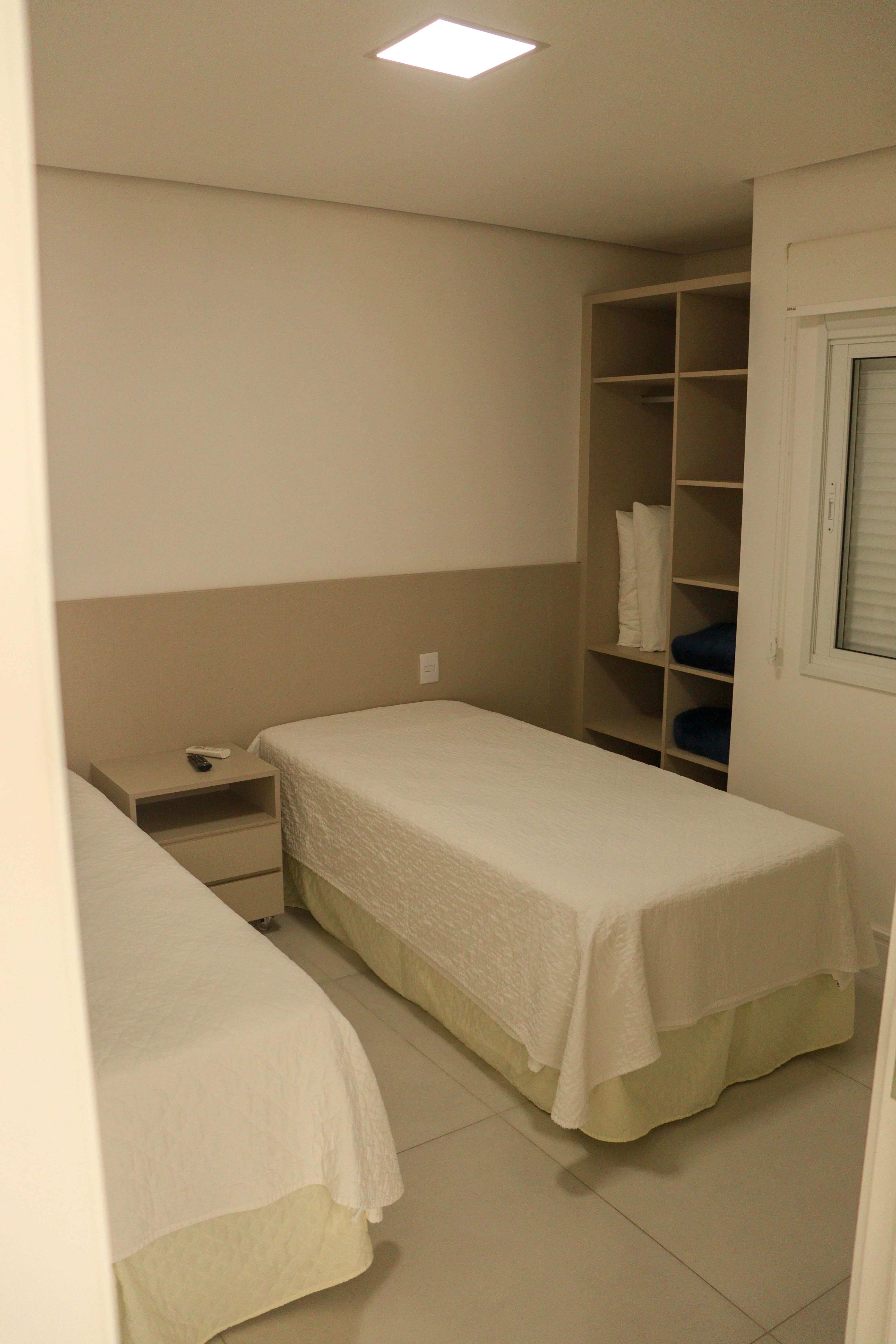 Apartamento com dois quartos (um casal + um com duas camas solteiros), banheiro, cozinha e sala integradas com bicama na sala. Sacada com churrasqueira. Café da manhã servido no hotel. Serviço de Camareira incluso diariamente. Localizado a 70 metros do hotel.
