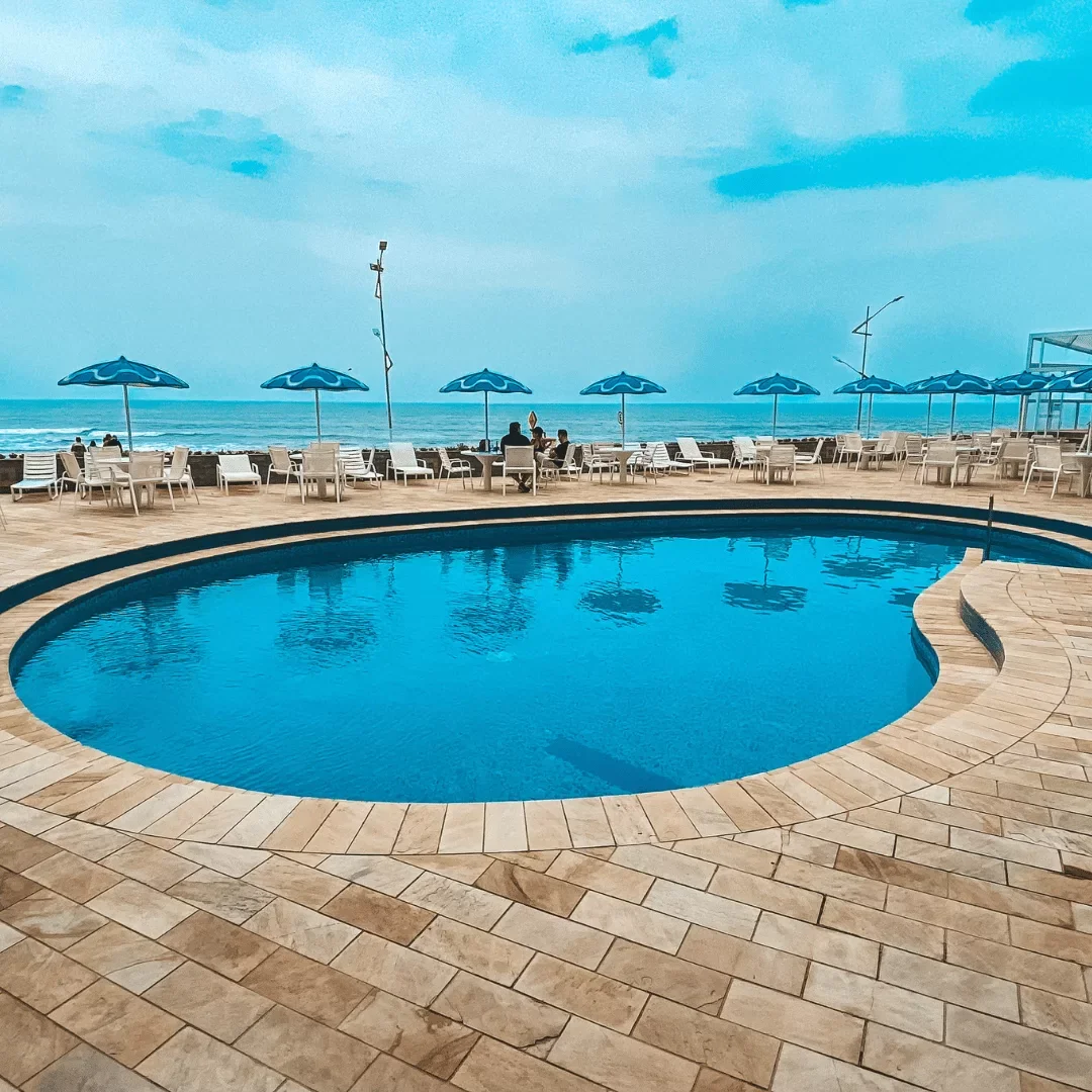 Piscina ampla com vista para o mar, ideal para se refrescar nos dias ensolarados.
